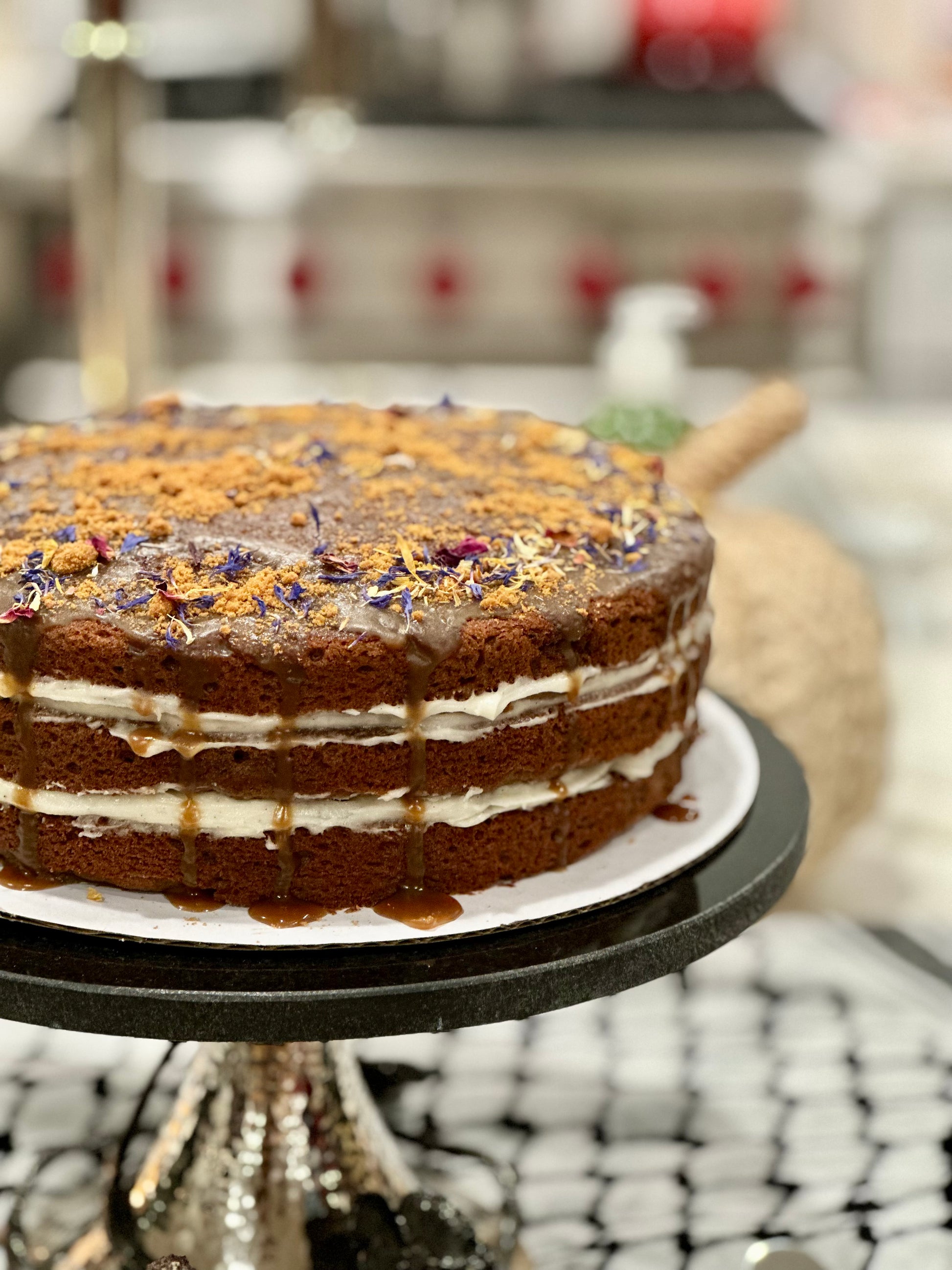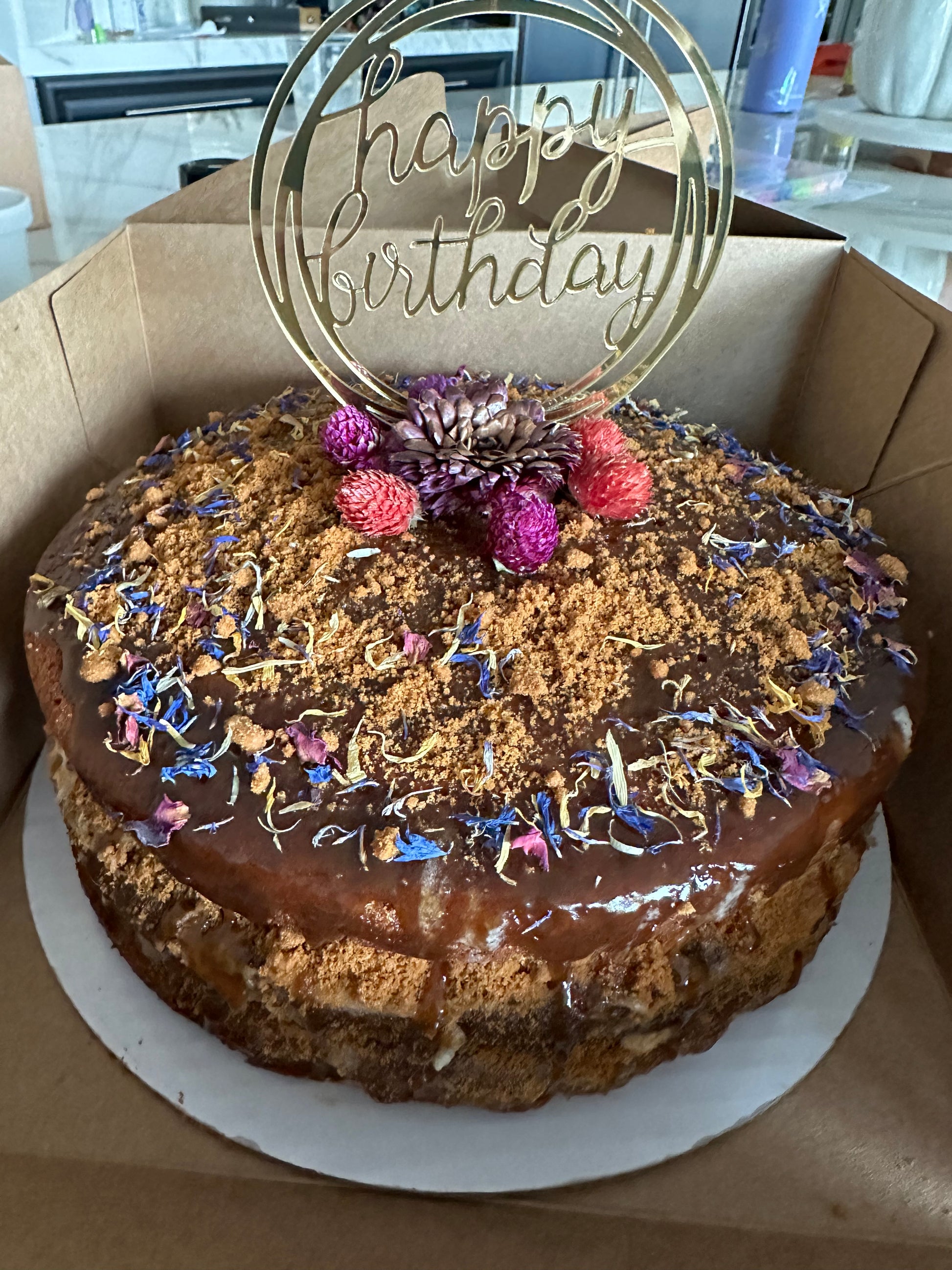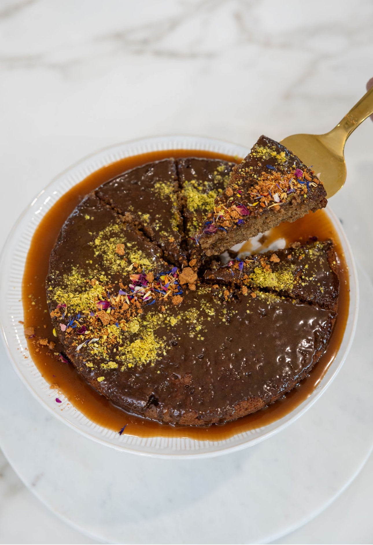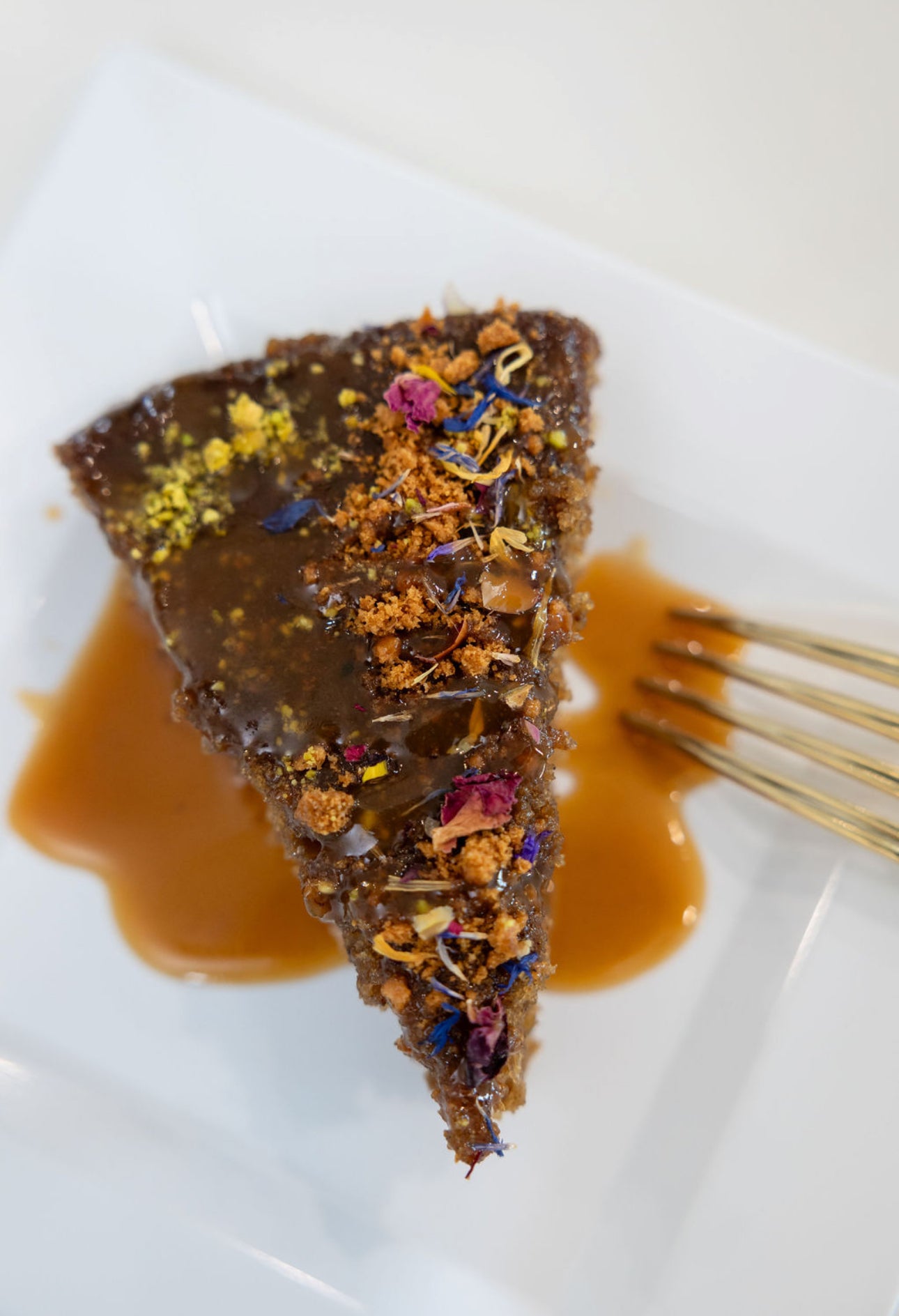 One layer of decadent sticky toffee pudding served with a salted English toffee sauce. Decorative garnish provided